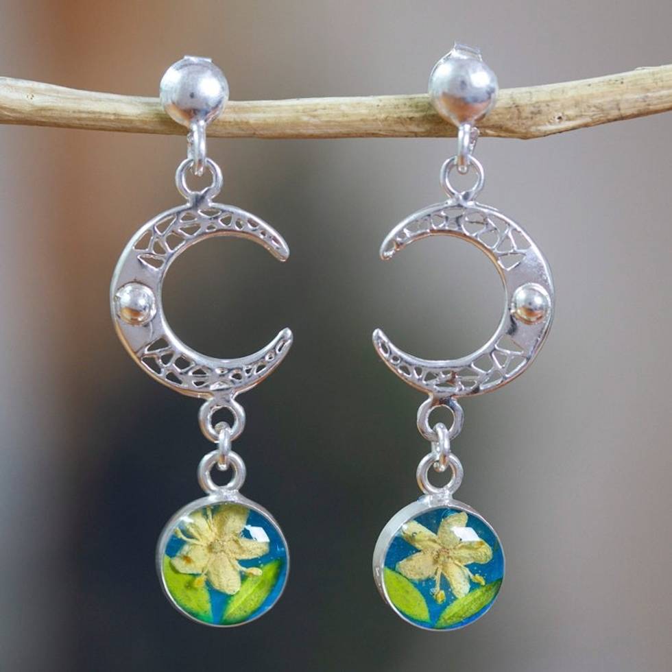 Sterling Silver Moon Dangle Earrings with Natural Flowers 'Spring Moons' Item ID: 2671807497