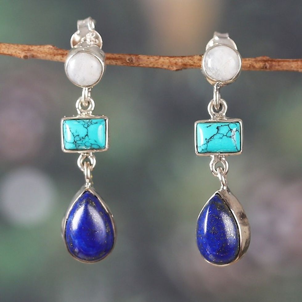 Sterling Silver Multi-Gemstone Dangle Earrings from India 'Blue Ode' Item ID: 2671782416