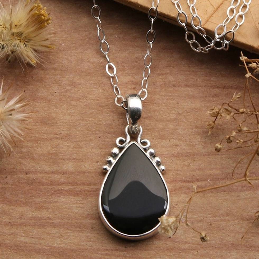 Sterling Silver Onyx Pendant Necklace with Dot Accents 'Snowy Night' Item ID: 2671763988