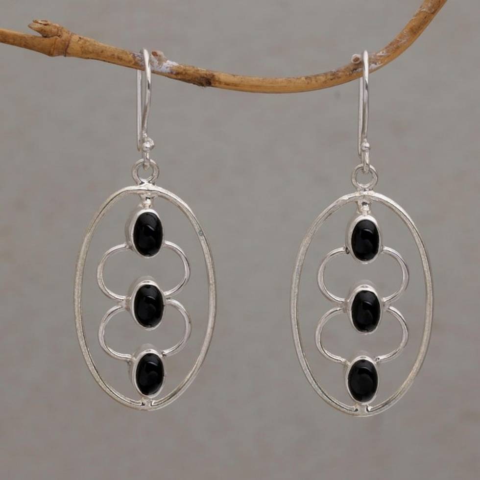 Sterling Silver Oval and Black Onyx Dangle Earrings 'Three Souls' Item ID: 2671733827