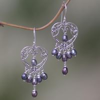 Sterling Silver Pearl Heart Shaped Earrings 'Heart Symphony in Black' Item ID: 2671821564
