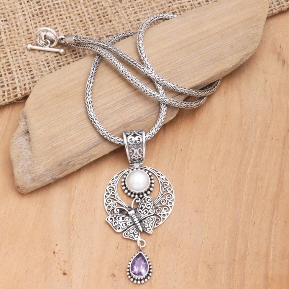 Sterling Silver Pendant Necklace with Amethyst and Pearl 'Purple Butterfly Teardrop' Item ID: 2671747800