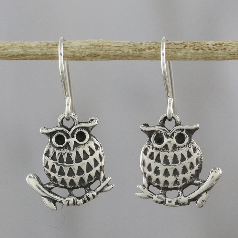 Sterling Silver Perched Owl Dangle Earrings from Thailand 'Chiang Mai Owl' Item ID: 2669925771