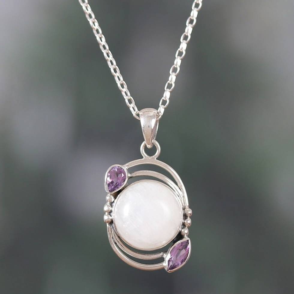 Sterling Silver Rainbow Moonstone Amethyst Pendant Necklace 'Luminous Charm' Item ID: 2671783261