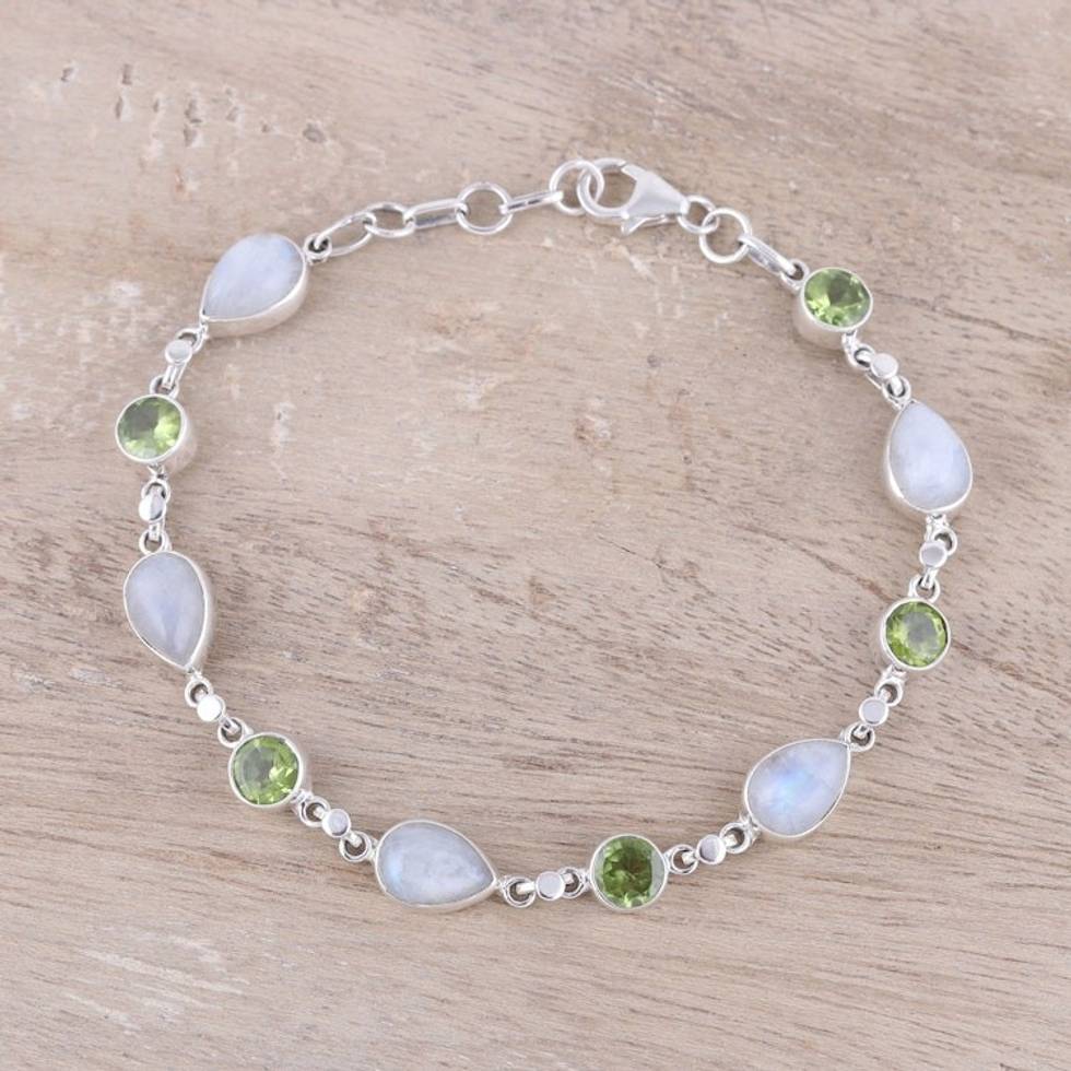 Sterling Silver Rainbow Moonstone and Peridot Link Bracelet 'Misty Forest' Item ID: 2669955413