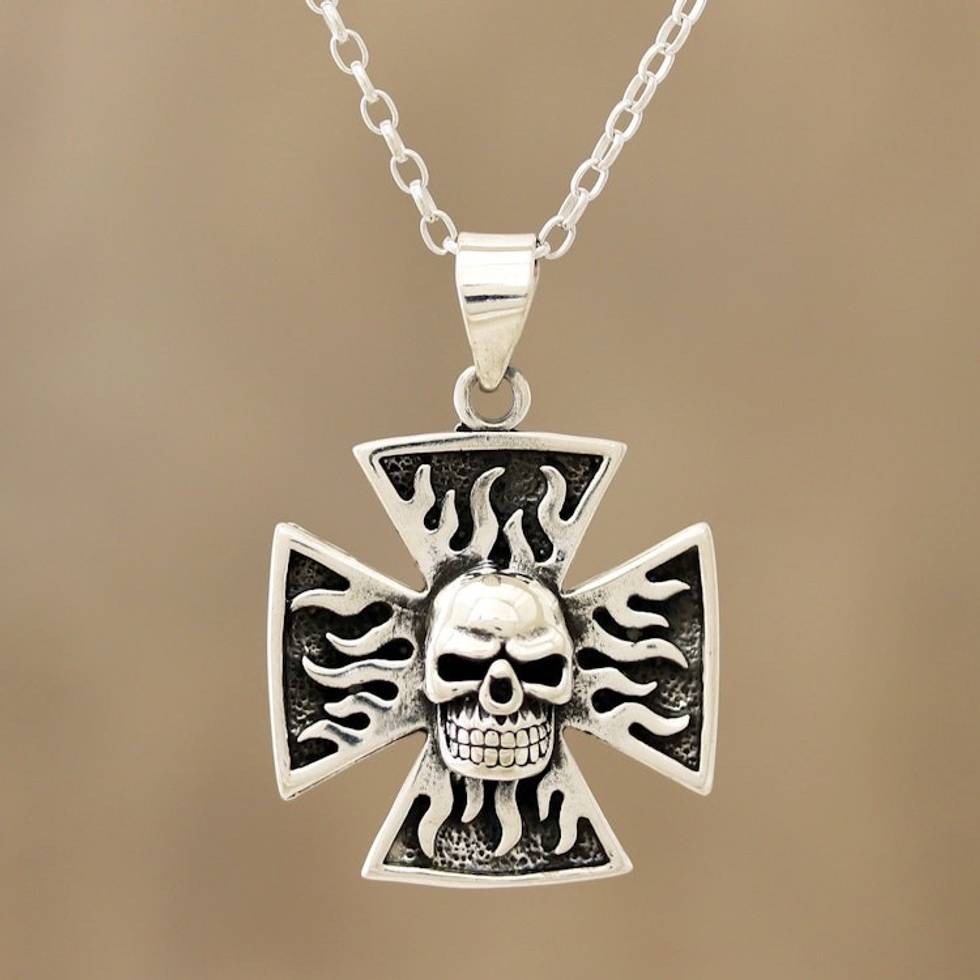 Sterling Silver Skull Cross Pendant Necklace from India 'Fiery Skull Cross' Item ID: 2671792469