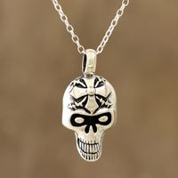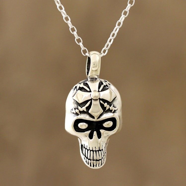Sterling Silver Skull Cross Pendant Necklace from India 'Grinning Cross' Item ID: 2671792303