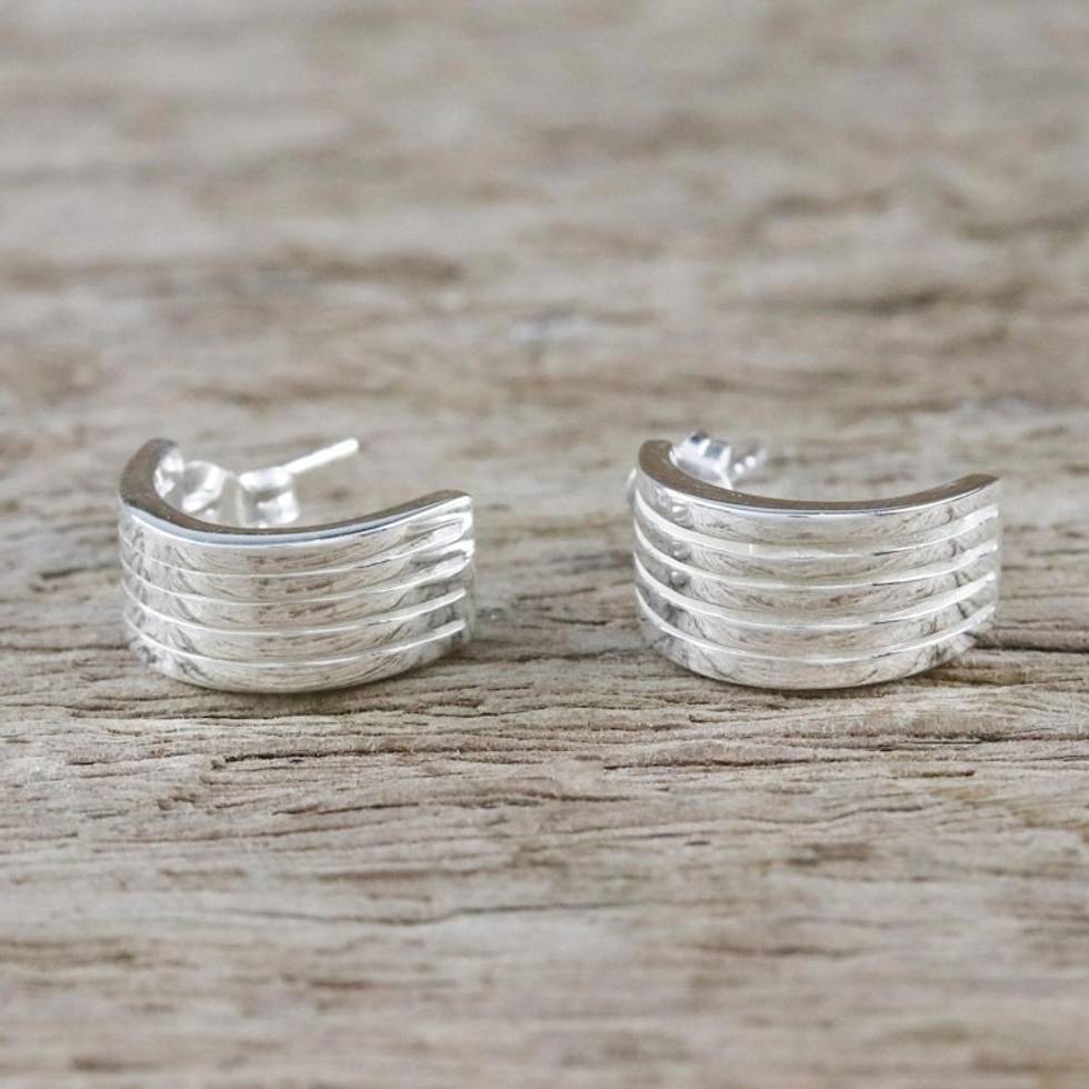 Sterling Silver Striped Half-Hoop Earrings from Thailand 'Shimmering Stripes' Item ID: 2671815419