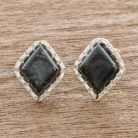 "Petite and precious, these earrings go everywhere in style. Carolina Quiroa works in sterling silver, centering the petite studs with dark green jade, so dark it seems almost black. The notched settings and diamond shape give them a modern look."