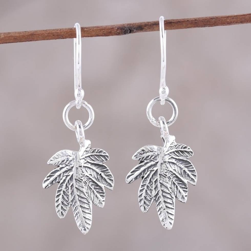 Sterling Silver Textured Leaves Dangle Earrings from India 'Fancy Foliage' Item ID: 2671792625