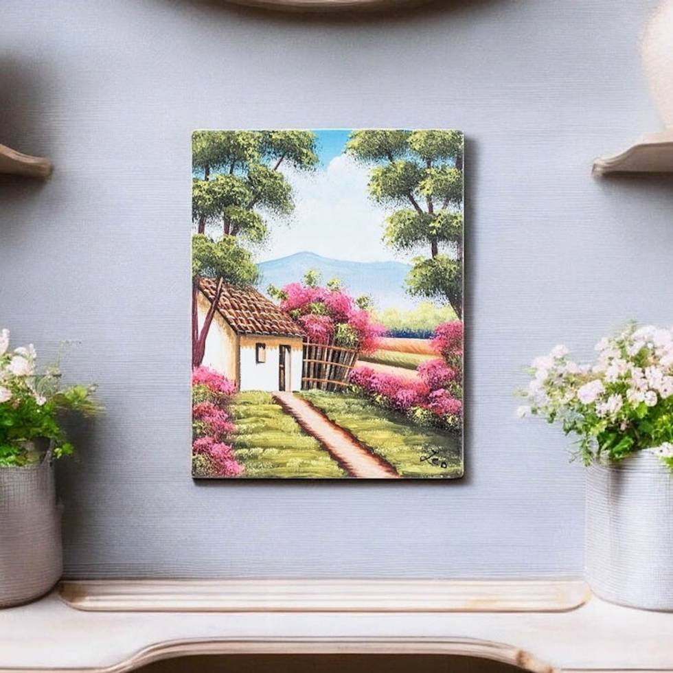 "Nature blesses Guatemala with a serene and colorful aura, inspiring artist Hugo Pichiya to depict the traditional streets and places of the region in stunning impressionist compositions. Using oil on canvas, the artisan depicts a little country house with flowers and trees in a vibrant palette.