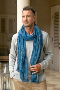 Striped Block-Printed Cotton Shawl in Indigo from India 'Indigo Stripes' Item ID: 2669925033