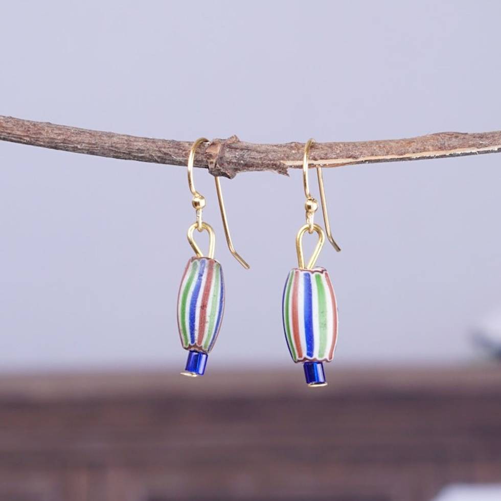 "Colorful and bold stripes add a stylish enchantment to these dangle earrings by Tina Quaye of Ghana. The artisan works with recycled glass beads to spread an environmental message, creating this stunning pair with a captivating allure. The earrings also have brass hooks for comfortable wear."