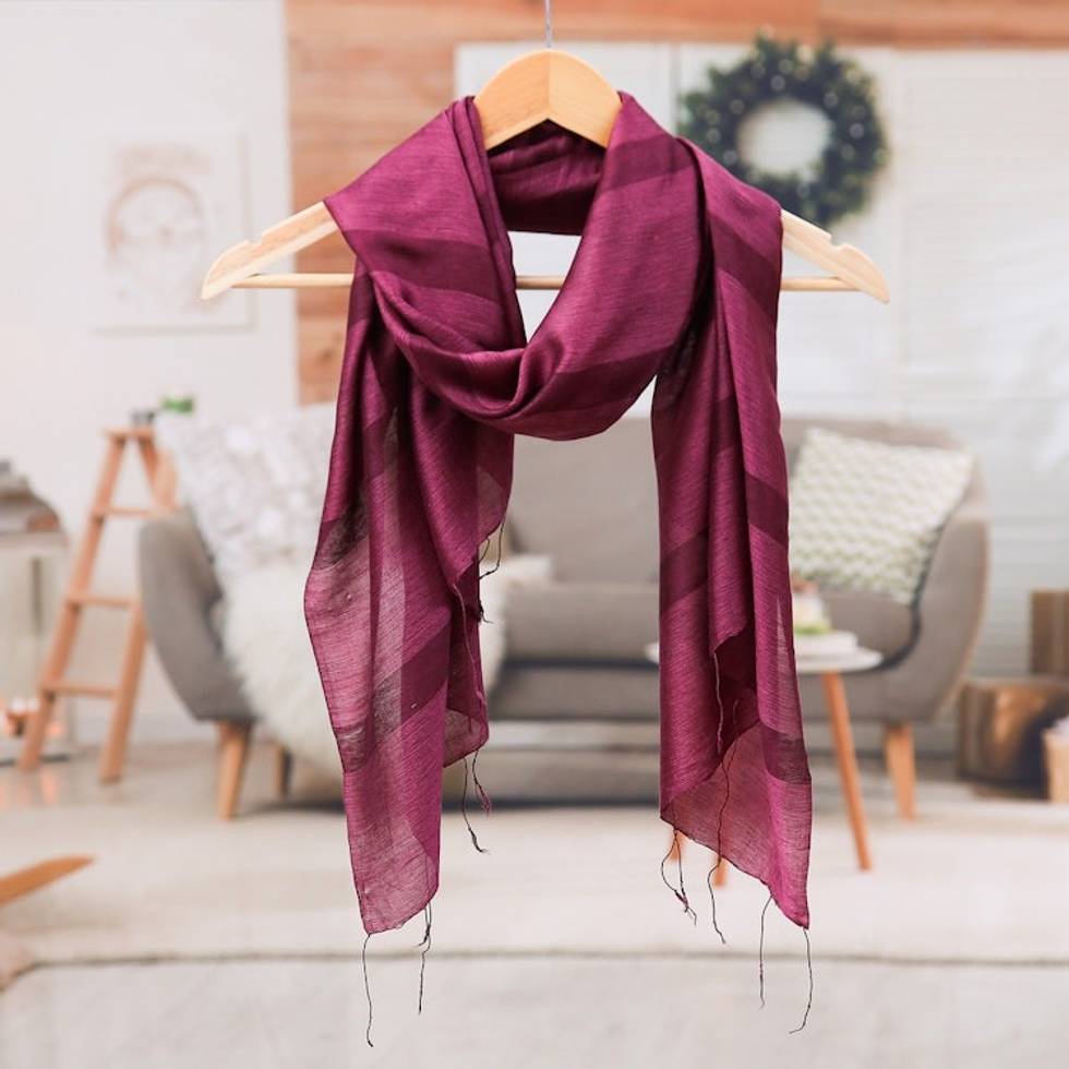 Striped Bordeaux Cotton and Silk Blend Scarf with Fringes 'Bordeaux Touch' Item ID: 2671646419
