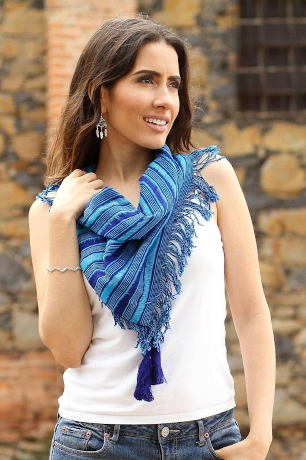 Striped Cotton Scarf in Cerulean and Royal Blue from Mexico 'Between Ocean Waves' Item ID: 2671640709