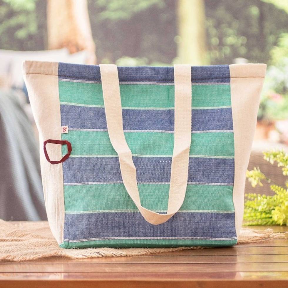 Striped Foldable Cotton Tote Bag Hand-Woven in Guatemala 'Pearls' Item ID: 2669933254