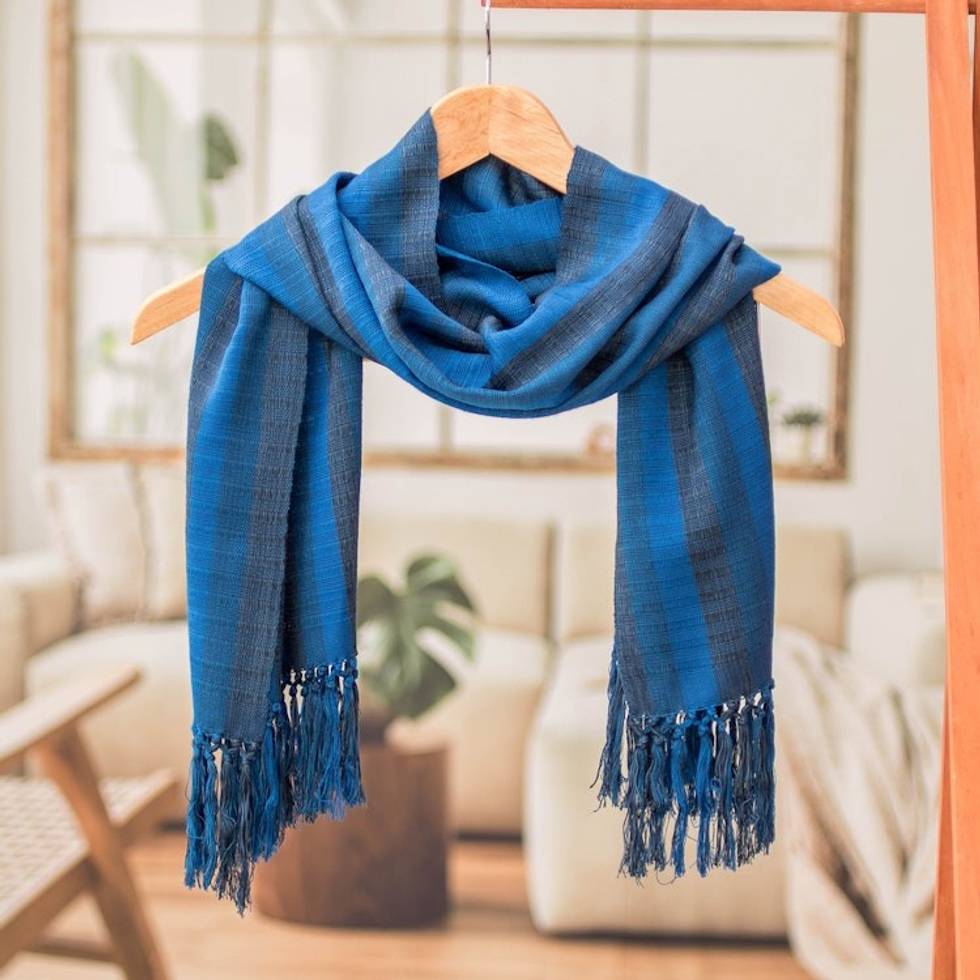 "Add a dash of sophistication with this striped cotton scarf expertly woven by local Guatemalan artisans. Featuring bright shades of blue and a fringed finish, Miriam and Debora's chic creation offers a perfect balance of vibrancy and movement. Whether wrapped around your neck or draped over your shoulders, this accessory is sure to turn heads."