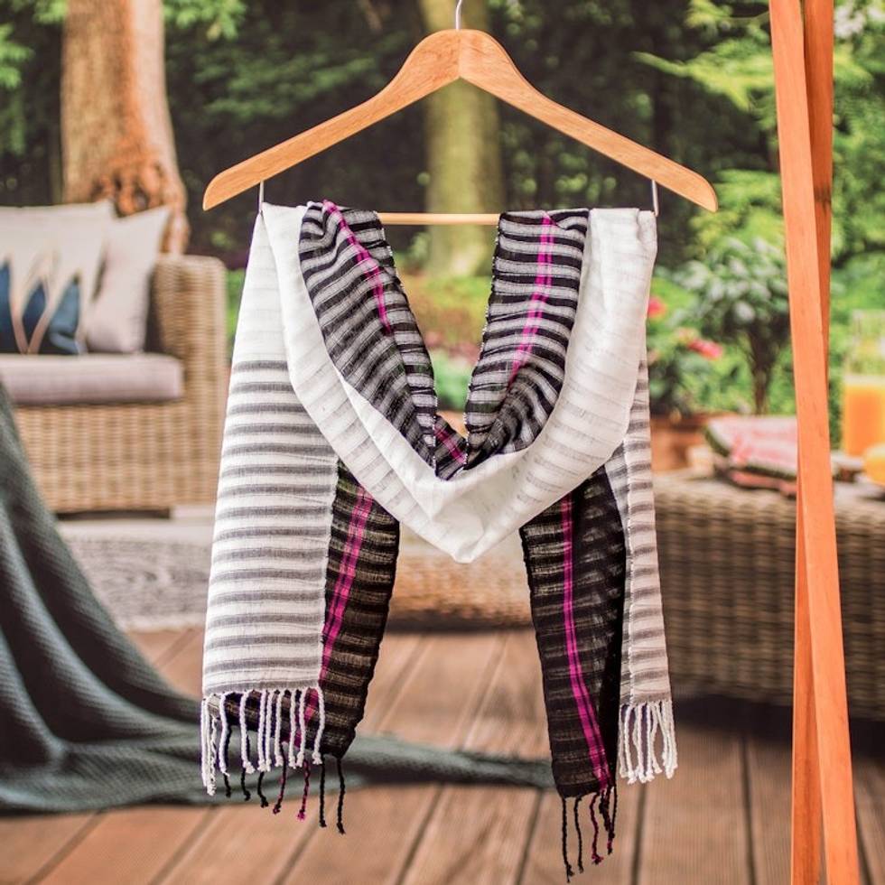 Striped Onyx and Ivory 100 Cotton Scarf Woven in Guatemala 'Light Shadow' Item ID: 2671768809