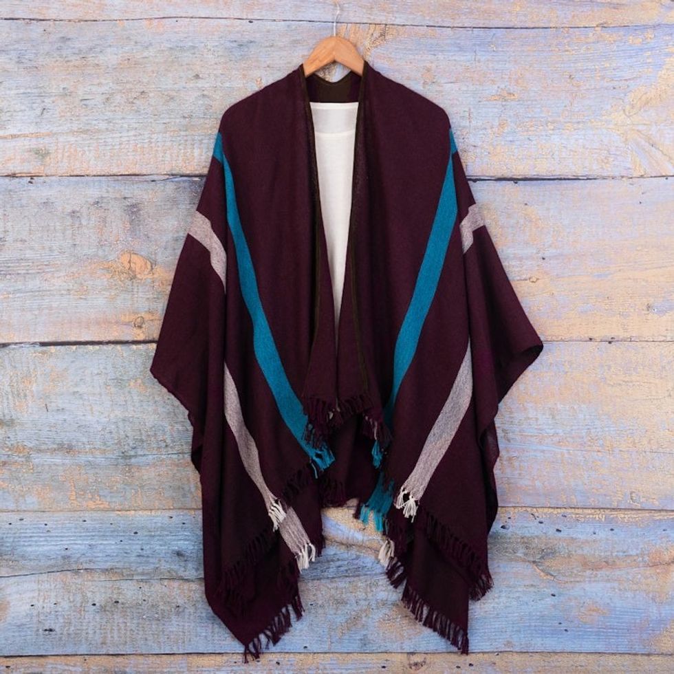 Striped Purple Ruana Woven from 100 Baby Alpaca with Fringe 'Iris Grape' Item ID: 2671698094