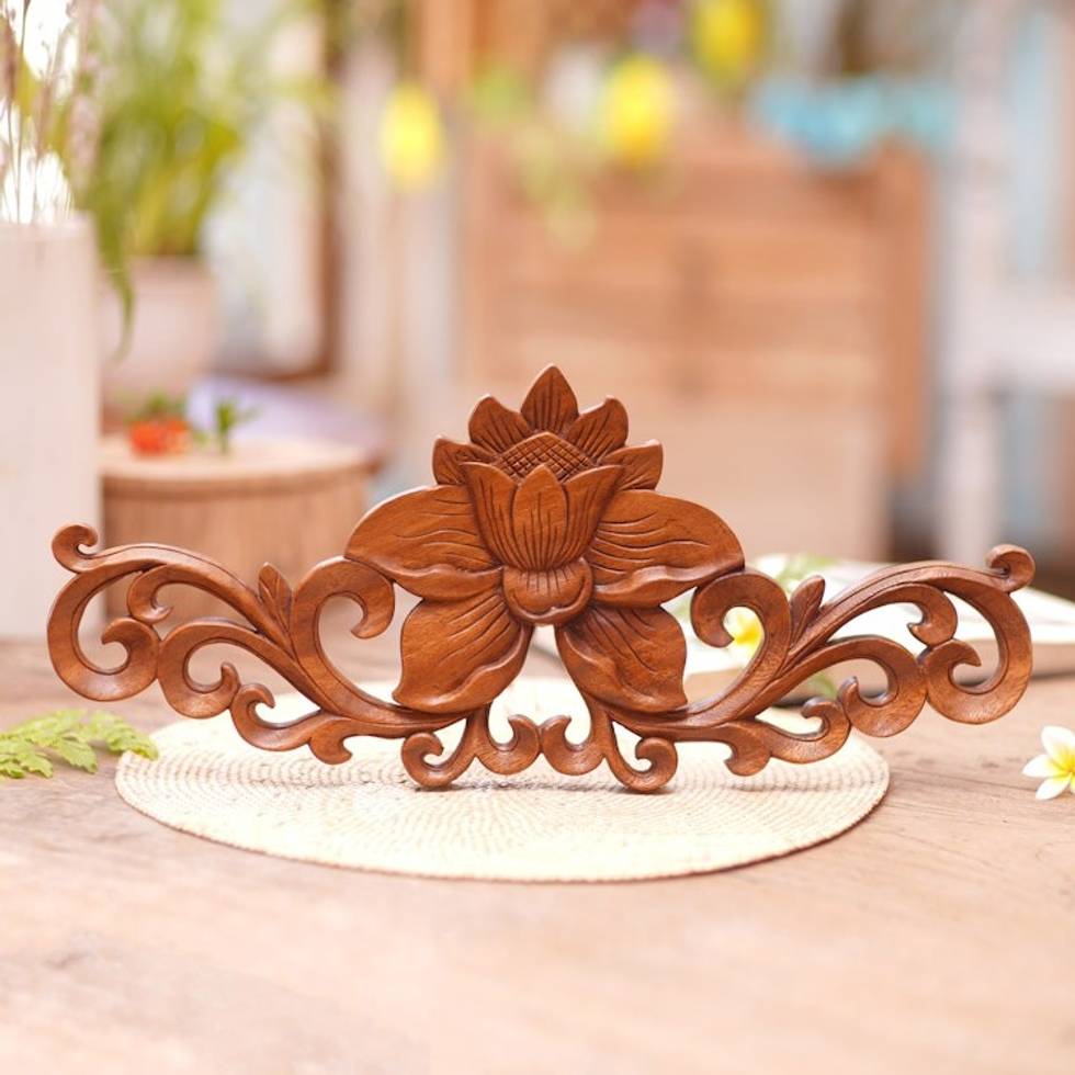 Suar Wood Balinese Lotus Relief Wall Sculpture 'Single Lotus' Item ID: 2671702126