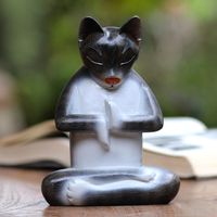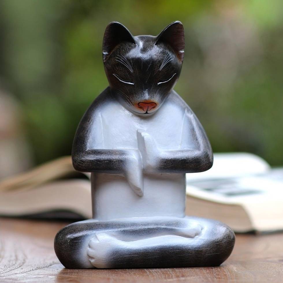 Suar Wood Lotus Pose Yoga Cat Sculpture in Grey from Bali 'Full Lotus Cat in Grey' Item ID: 2671744770