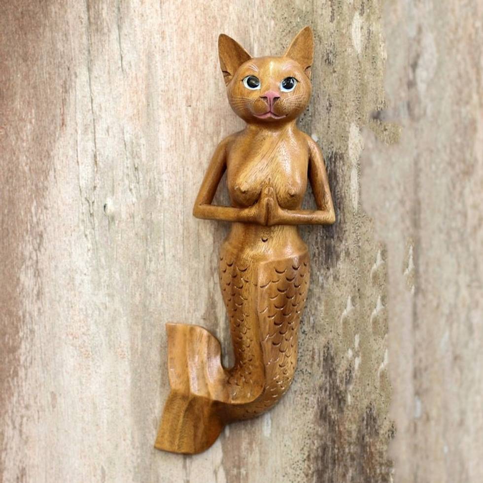 Suar Wood Mermaid Cat Wall Sculpture from Bali 'Mermaid Cat' Item ID: 2669891702