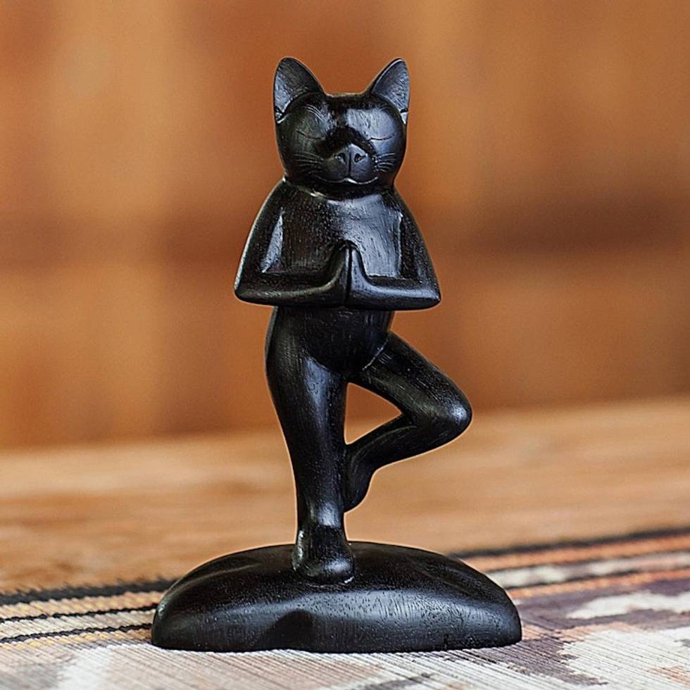 Suar Wood Sculpture 'Black Cat Tree Pose Yoga' Item ID: 2671702264