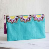 Sun Motif Embroidered Turquoise Cotton Cosmetic Bag 'Turquoise Sunbeams' Item ID: 2669892125