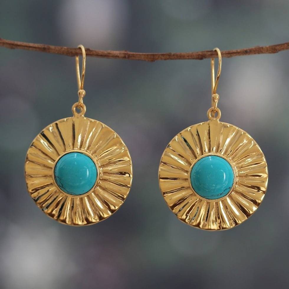 Sun-Themed Brass and Recon Turquoise Dangle Earrings 'Solar Calm' Item ID: 2671782897