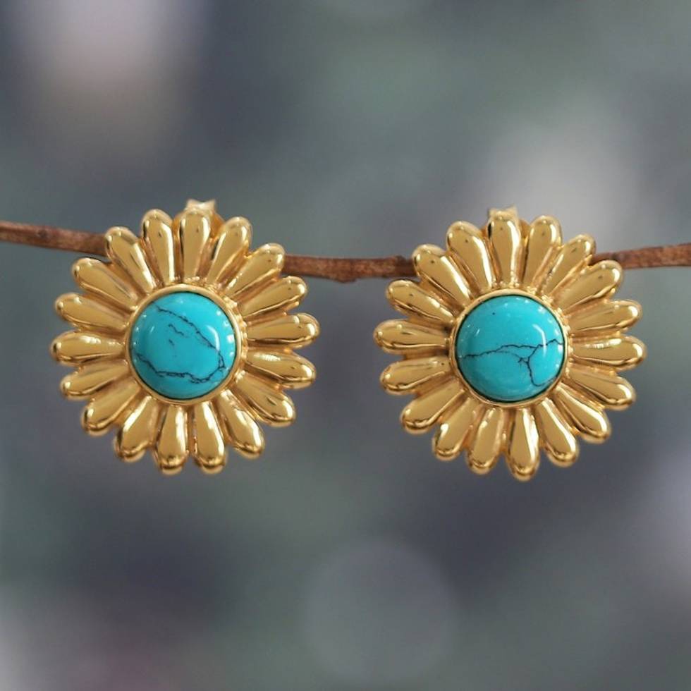 Sunflower-Themed Brass and Recon Turquoise Button Earrings 'Tranquil Blossom' Item ID: 2671781642