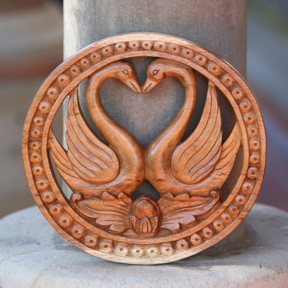 Swan-Themed Suar Wood Relief Panel from Bali 'Swan Romance' Item ID: 2671736466
