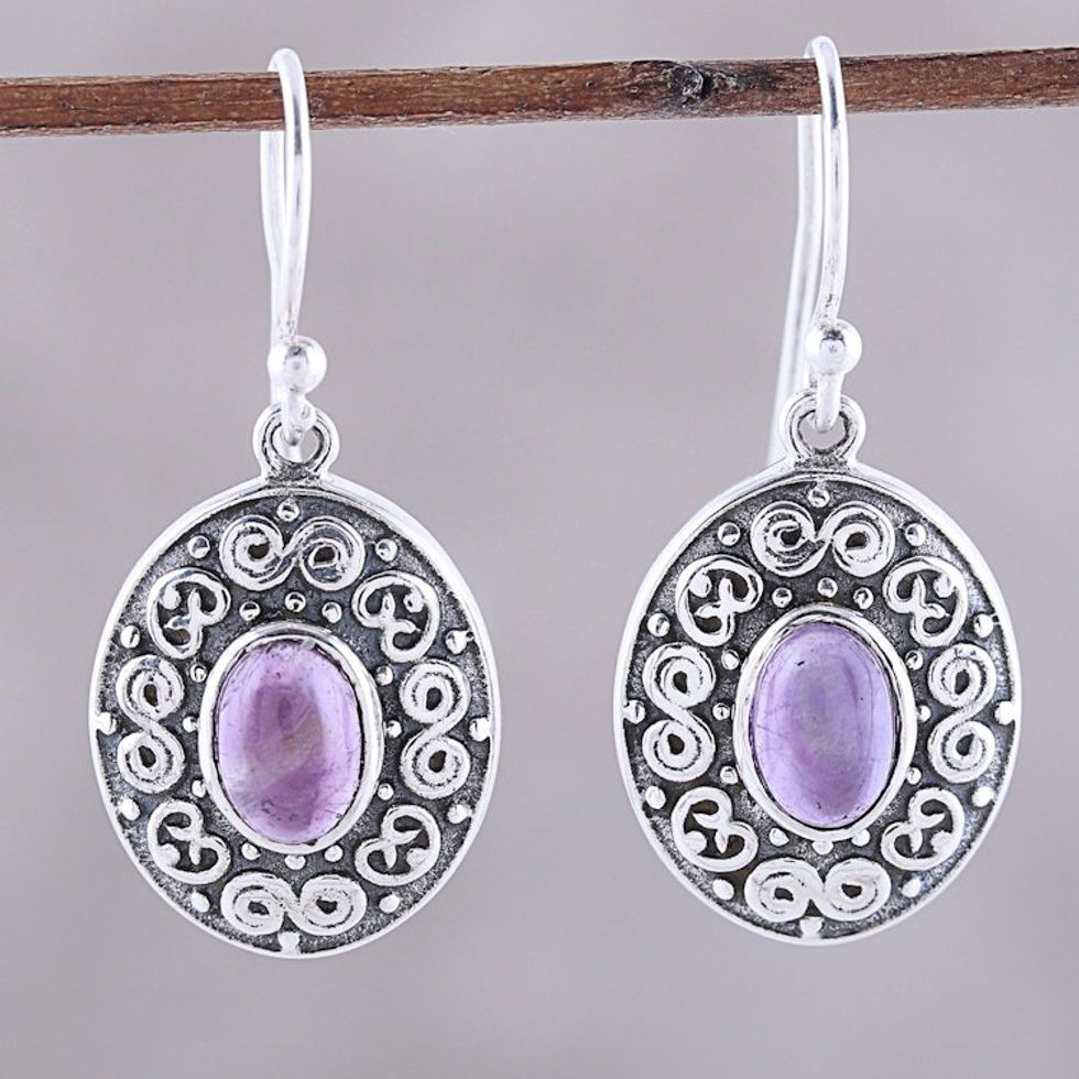 Swirl Motif Oval Amethyst Dangle Earrings from India 'Swirling Ellipse' Item ID: 2671792785