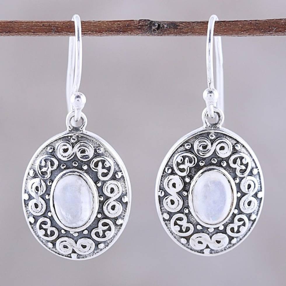 Swirl Motif Rainbow Moonstone Dangle Earrings from India 'Swirling Ellipse' Item ID: 2671792656