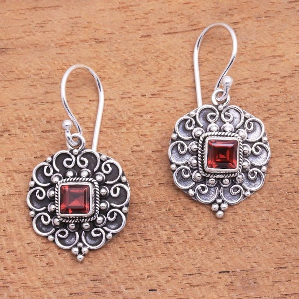 Swirl Pattern Garnet Dangle Earrings from Bali 'Fluffy Clouds' Item ID: 2671737132