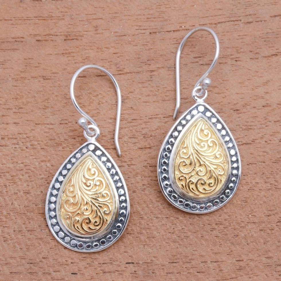 Swirl Pattern Gold Accented Sterling Silver Dangle Earrings 'Droplet Frames' Item ID: 2669920981