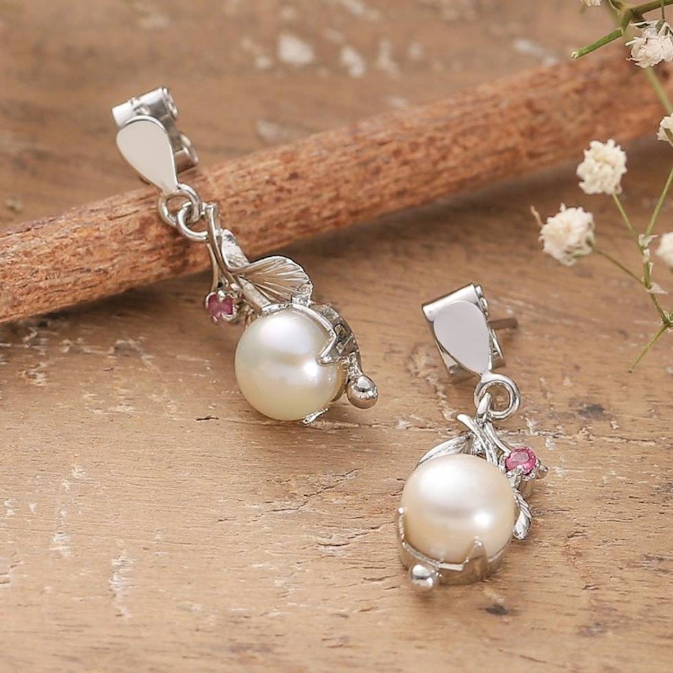 Sylvan-Inspired Cream Pearl and Faceted Ruby Dangle Earrings 'Capricious Paradise' Item ID: 2671781450