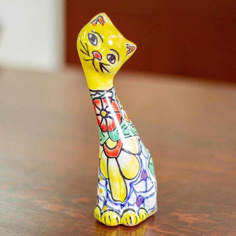 Talavera Style Yellow Floral Ceramic Cat Statuette 'Yellow Talavera Cat' Item ID: 2671639193