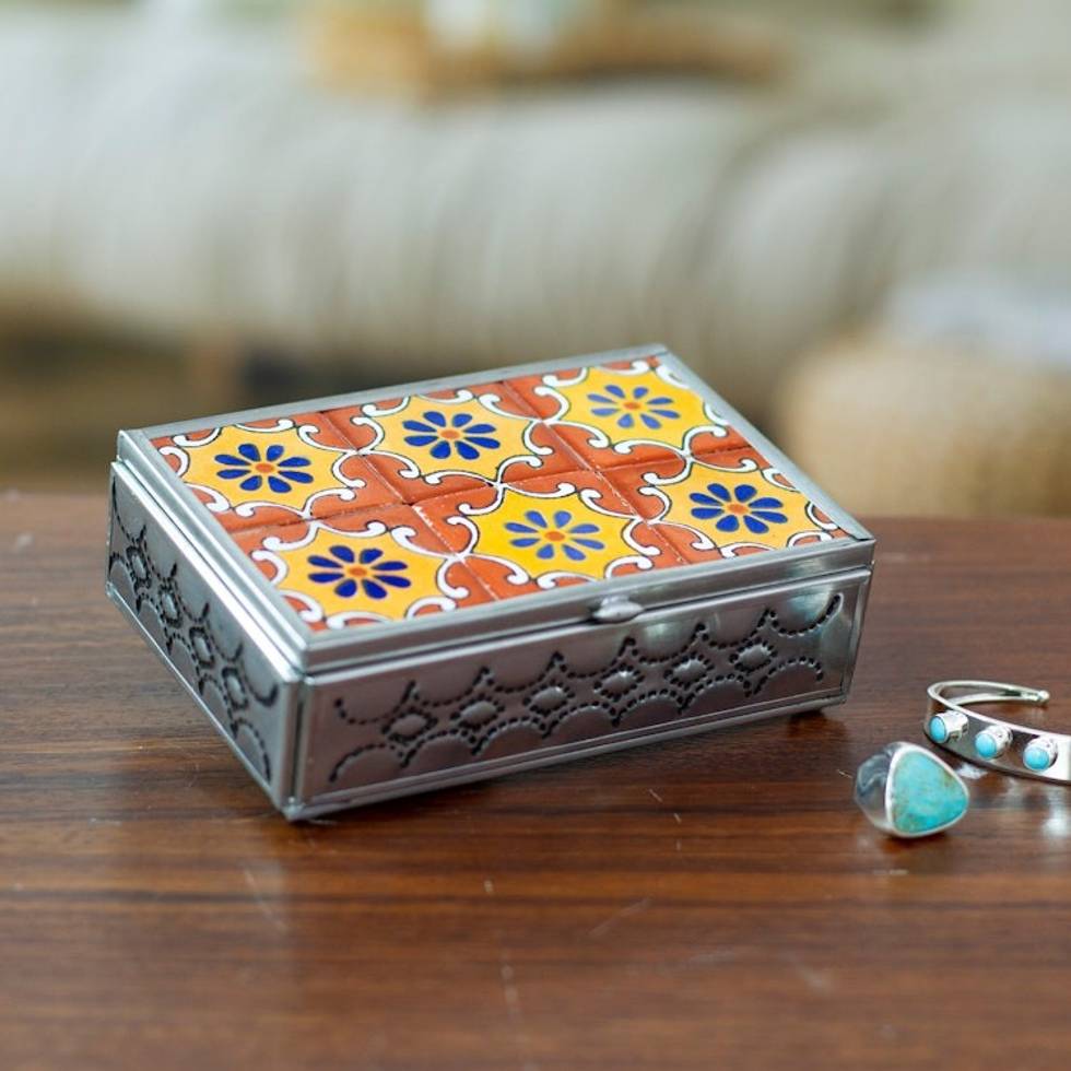 Talavera Tin and Ceramic Jewelry Box in Orange and Yellow 'Palace of Suns' Item ID: 2669898084