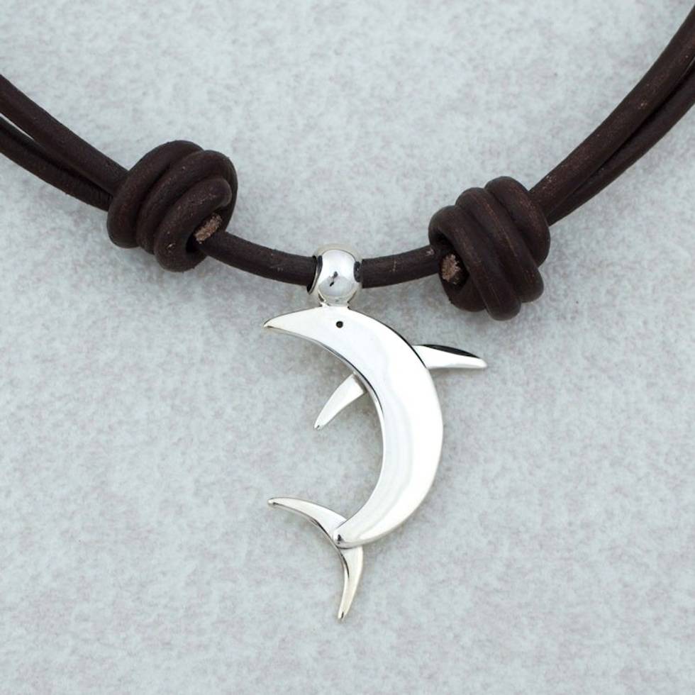 "Sleek and shining, a lithe little dolphin leaps on a length of brown leather cord. Mikelo carries on the Taxco jewelry traditions of his father and grandfather. He crafts the pendant from gleaming sterling silver with the crescent moon shapes that characterize much of his work.
