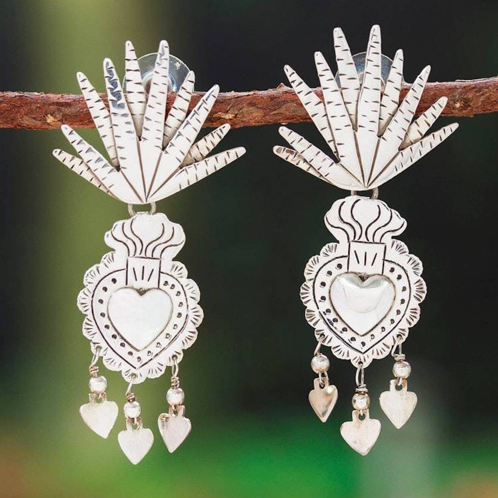 Taxco Sterling Silver Heart and Agave Chandelier Earrings 'Hearts and Nature' Item ID: 2676646881