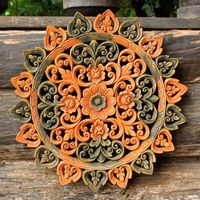 "Radiant like the sun, this panel glows with pristine beauty. Tay Nontawat carves two different pieces of teak wood with a floral medley. When each is finished, he incorporates the two into one resplendent piece. Nontawat's carving excellence can be seen in the detail, which he achieves with a fine chisel and knife. After leaving the wood to dry, he applies color with lacquer paints."