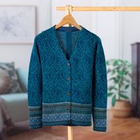 Teal 100 Alpaca Wool Cardigan Sweater from Peru 'Dreamy Blues' Item ID: 2669891313