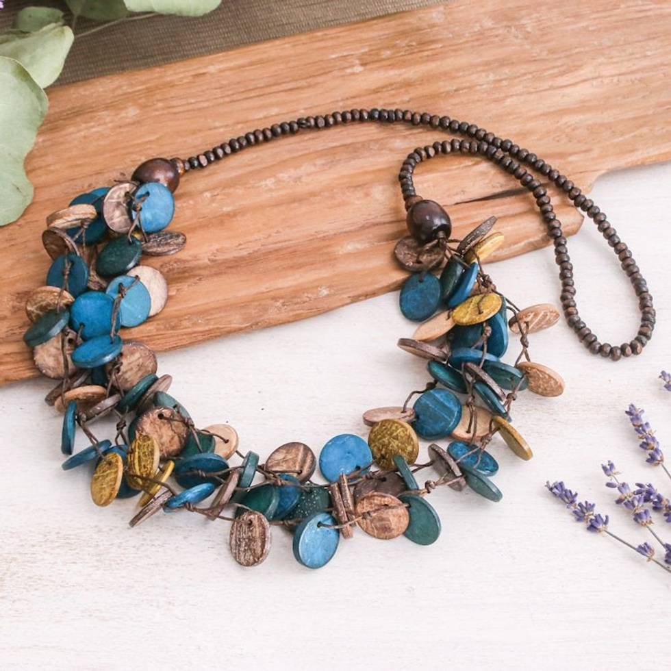 Teal and Golden Round Wood Beaded Three-Strand Necklace 'Cycles of Majesty' Item ID: 2671796641