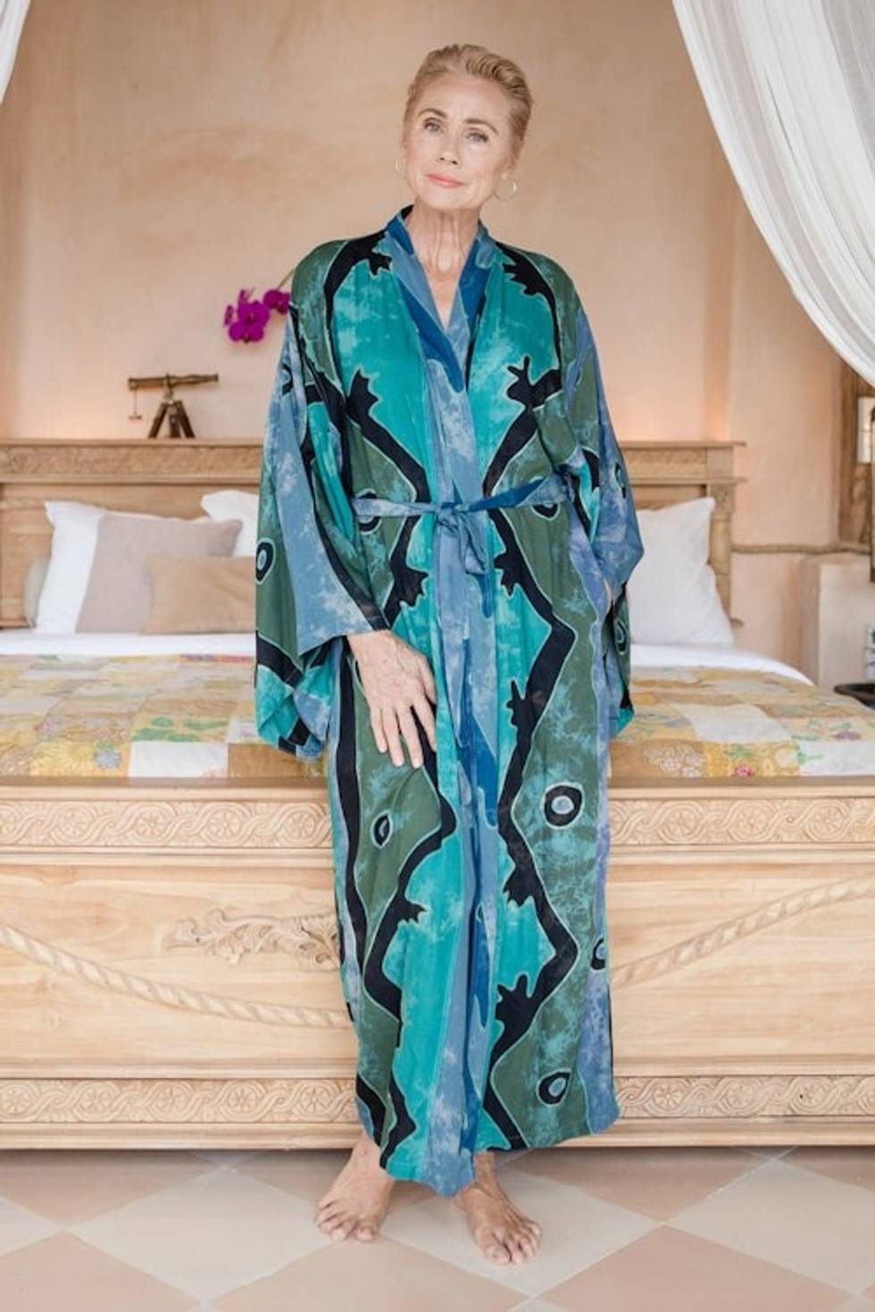Very pretty robe with blue, purple and green. Feels very soft and light weight when wearing it. My husband thinks it looks great too. It is generously sized but does not feel like too much fabric. It washes well - I use delicate, cold water and let air dry. I am 5’9” tall so it does not come all the way to my ankles but it is longer than most at pprox 52” from center neck to hem. Thank you Desak Nyoman Parwati for a beautiful robe.