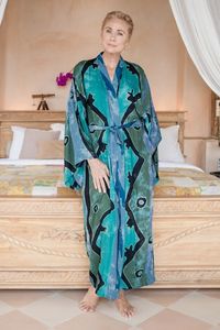 Teal Black and Blue Rayon Batik Long Sleeved Lounge Robe 'Atmosphere' Item ID: 2671736743