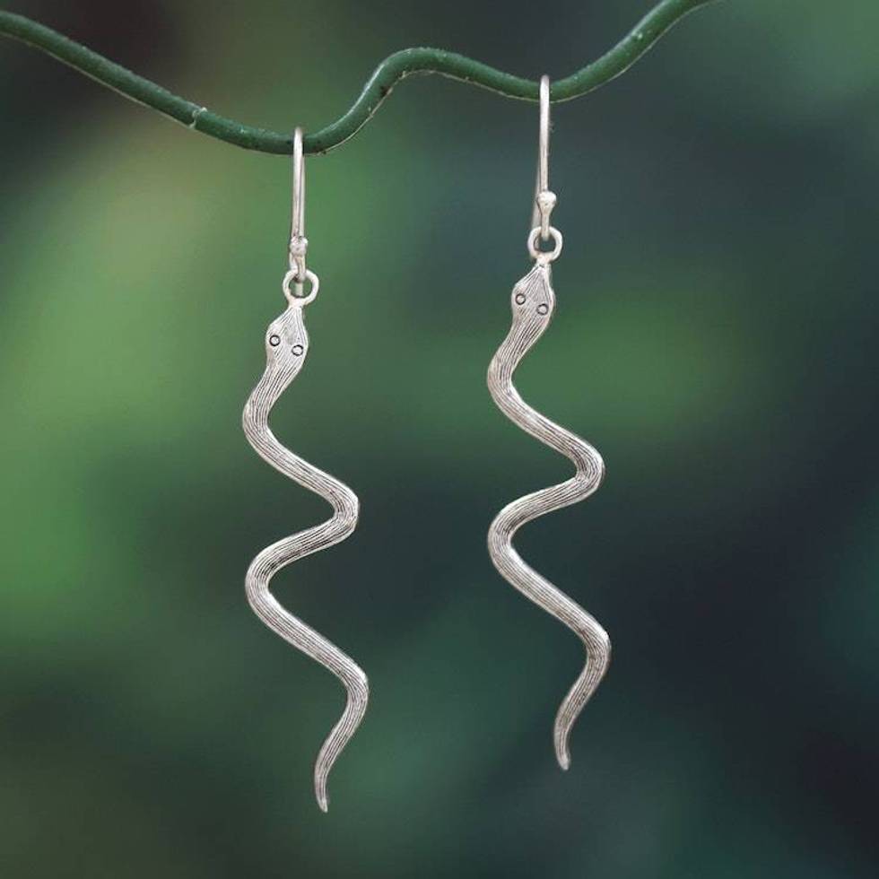 Textured Whimsical Sterling Silver Snake Dangle Earrings 'Twin Snakes' Item ID: 2676661450