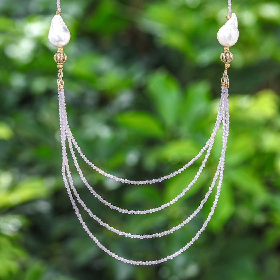Thai 18k Gold-Accented Pearl and Quartz Pendant Necklace 'Icy Shores in White' Item ID: 2671797304