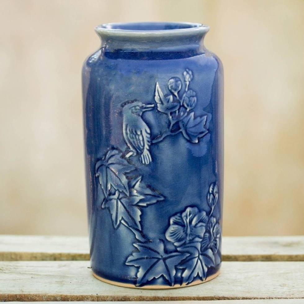 Thai Artisan Crafted Blue Ceramic Vase with Bird Motif 'Peaceful in Blue' Item ID: 2671801926
