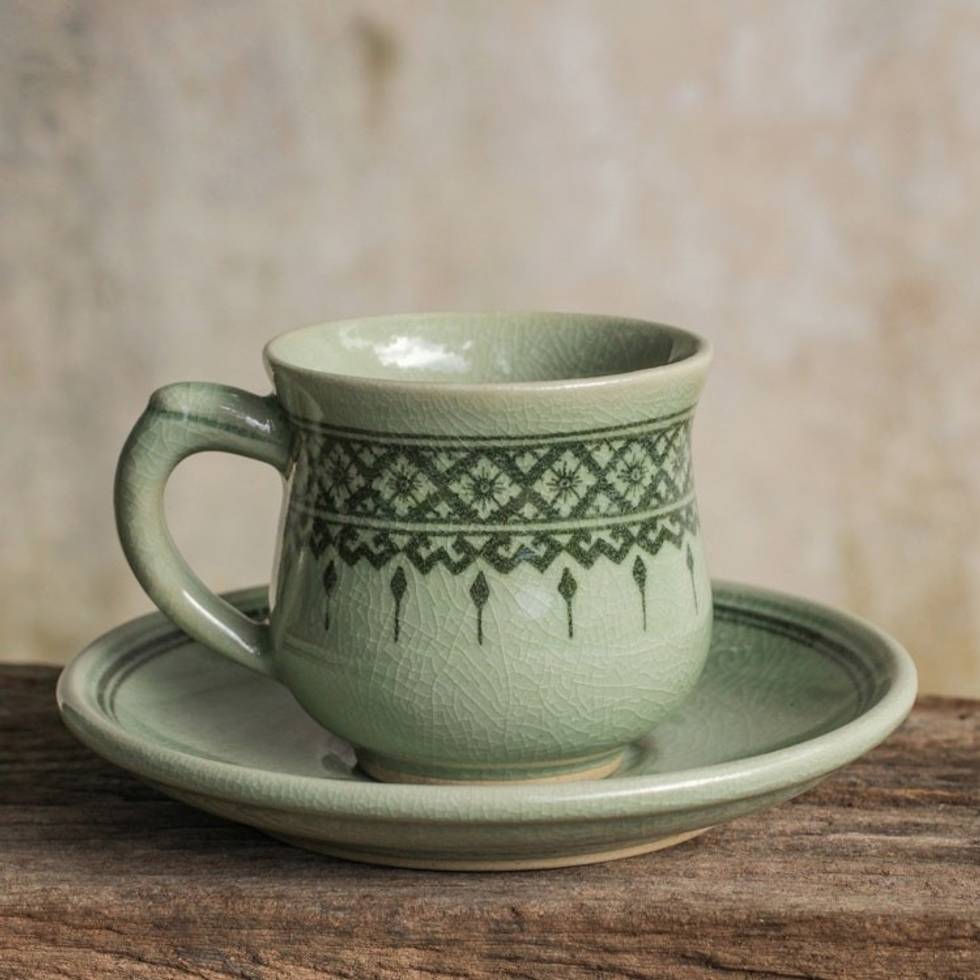 Thai Artisan Crafted Green Celadon Cup and Saucer 'Thai Weavings' Item ID: 2669897433