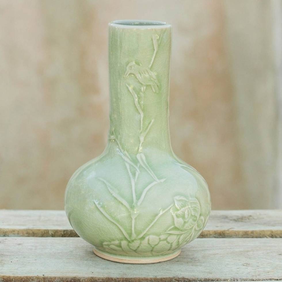 Thai Artisan Crafted Nature Inspired Ceramic Green Vase 'Tranquility' Item ID: 2671801847
